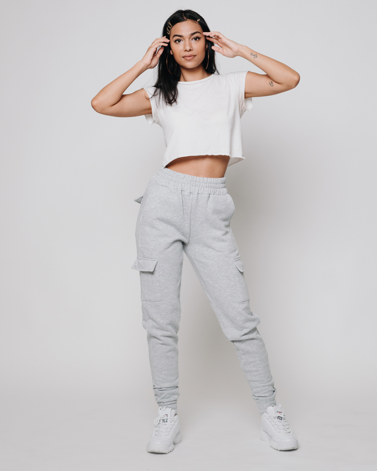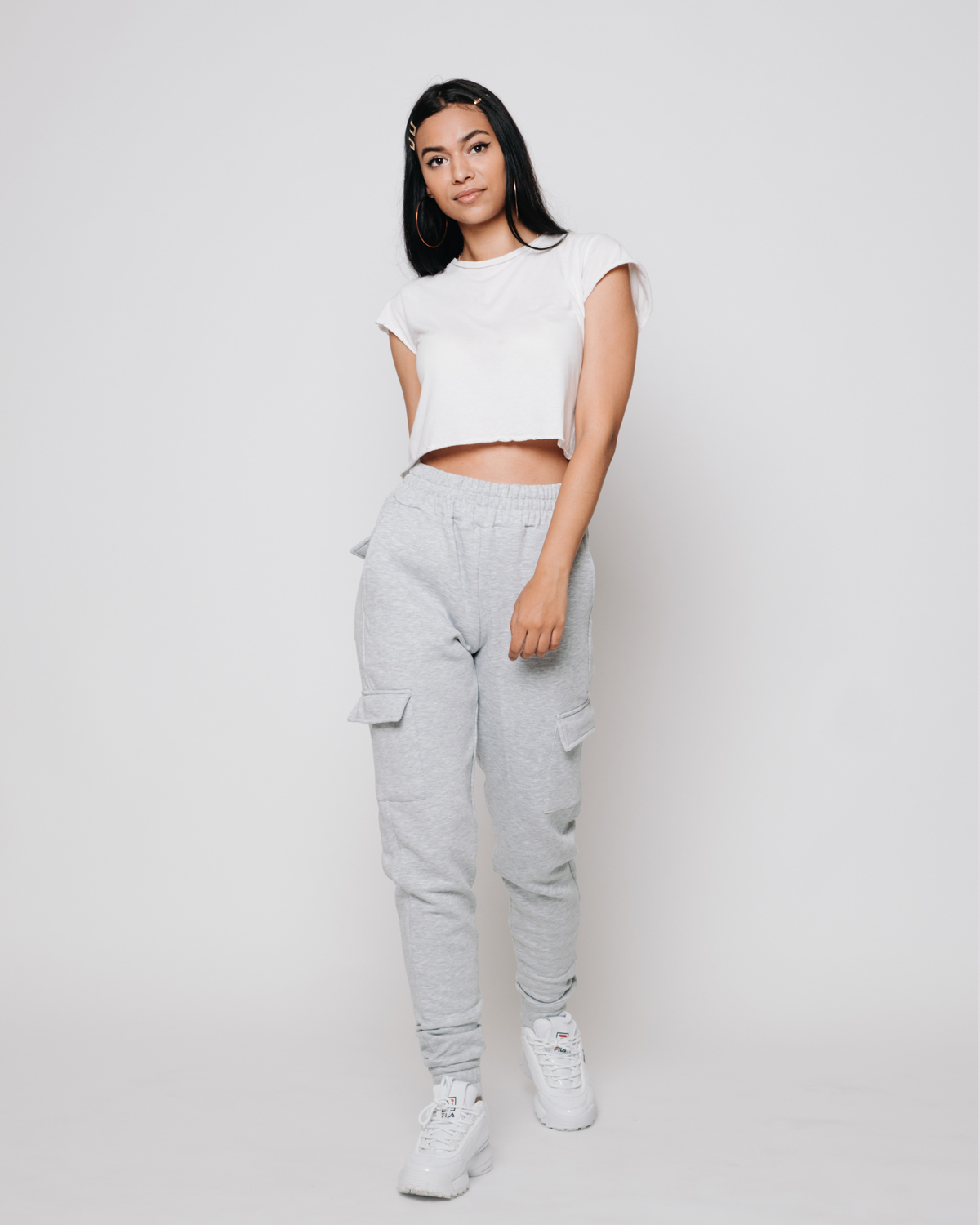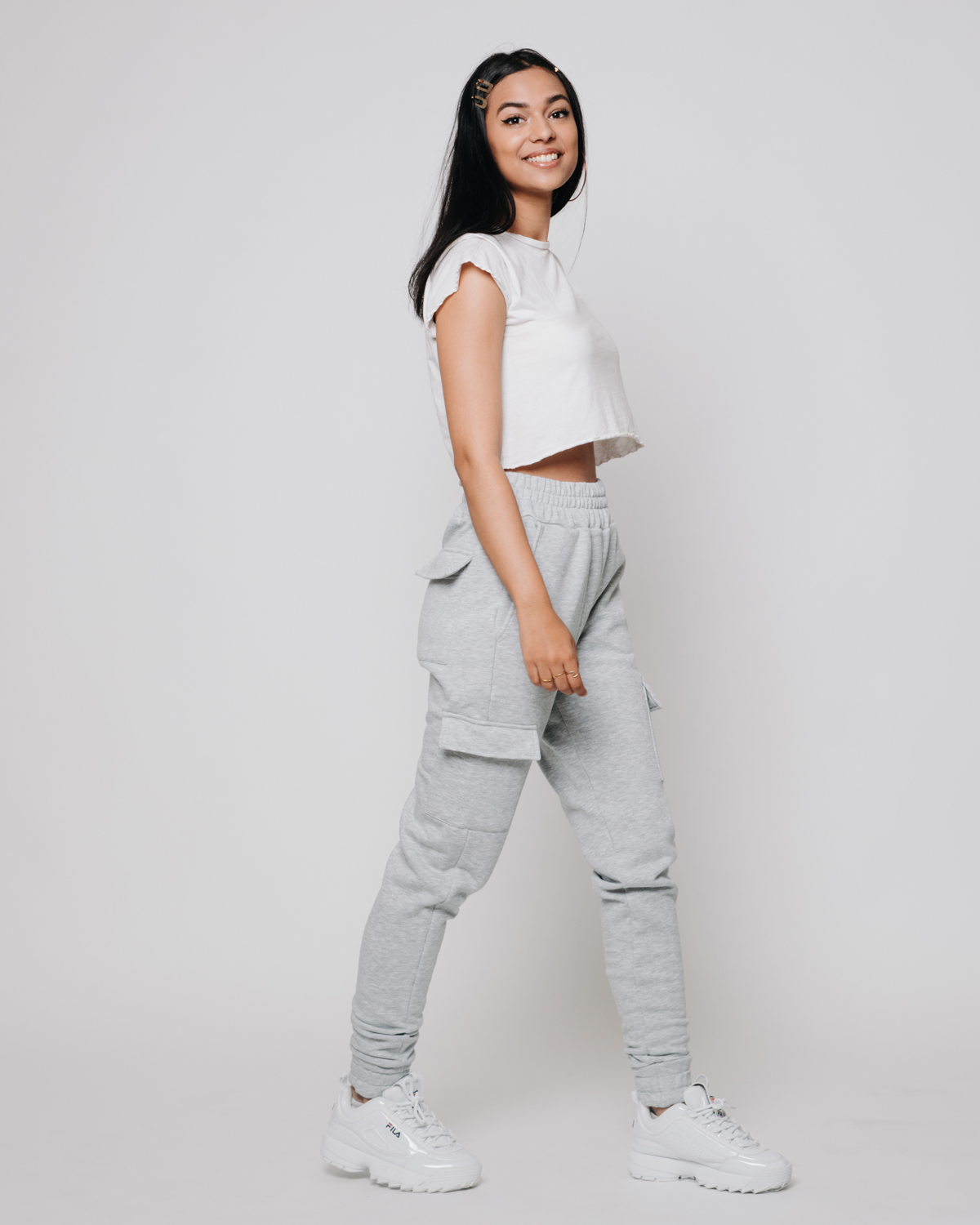 Čistý design a pohodlie zároveň. Naše nové tepláky v šedej farbe perfektne sedia a kopírujú krivky tela vďaka gume v páse a na kotníkoch. Vrecká vzadu a na bokoch dávajú teplákom military nádych. Pozor? Pohov!